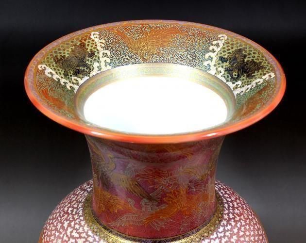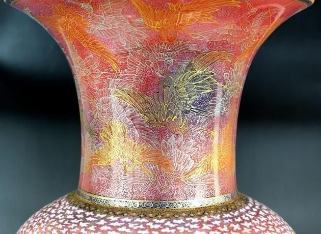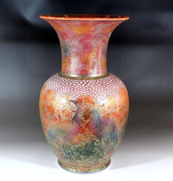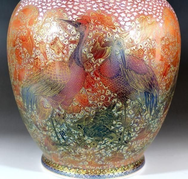 This hand-painted Arita porcelain vase by ceramic artist Kinsai Fujii features crane and tortoise motifs, symbolizing longevity and prosperity. Standing at 48 cm tall with a diameter of 29 cm, the intricate designs are highlighted with gold accents. Crafted using traditional techniques, this piece is ideal for gifts or as a collector's item.