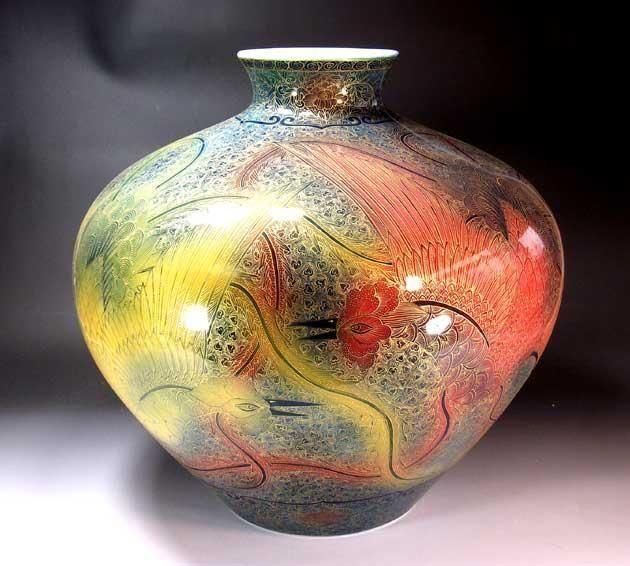Traditional Japanese Porcelain Arita Ware Phoenix Painted Vase by Ceramic Artist Kinsai Fujii