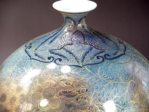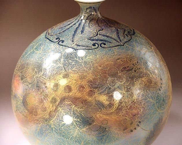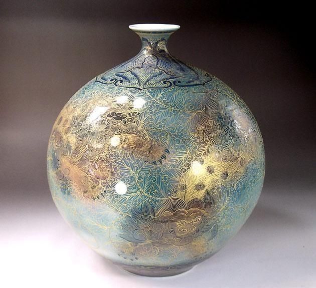 Traditional Japanese Arita Ware Vase with Lion Design by Ceramic Artist Kinsai Fujii